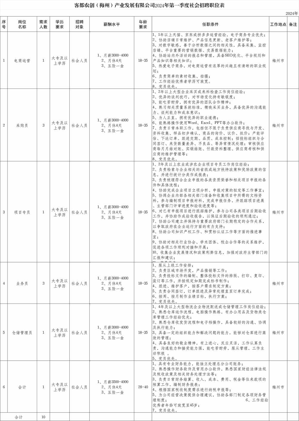 客都农创(梅州)产业发展有限公司2024年第一季度社会招聘职位表