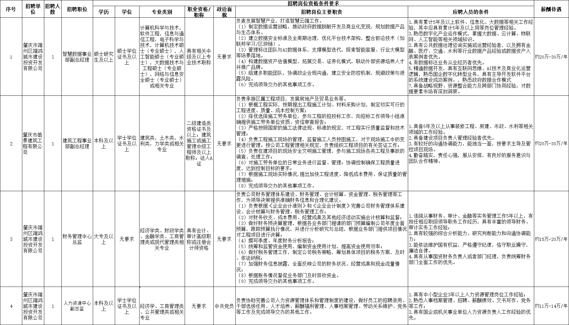 招聘岗位及条件详见《肇庆市端州区端鸿城市建设投资开发有限公司及其下属子公司2025年招聘管理人员岗位表》(附件1)。